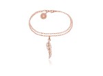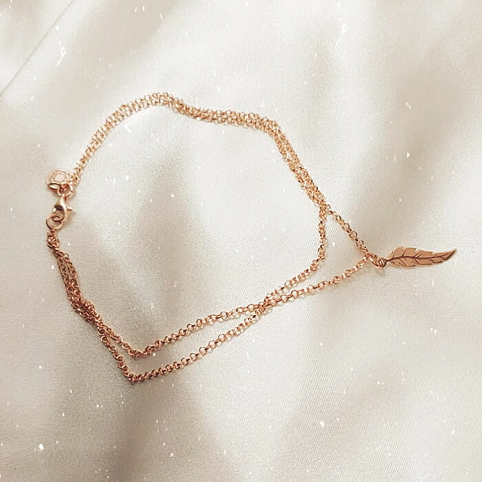 Bransoletka składa się z dwóch łańcuszków jednakowej długości zaczepionych na jedno zapięcie. Na dolnym łańcuszku dołączona jest zawieszka w kształcie piórka.