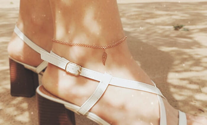 Podwójna bransoletka łańcuszkowa na nogę z piórkiem.