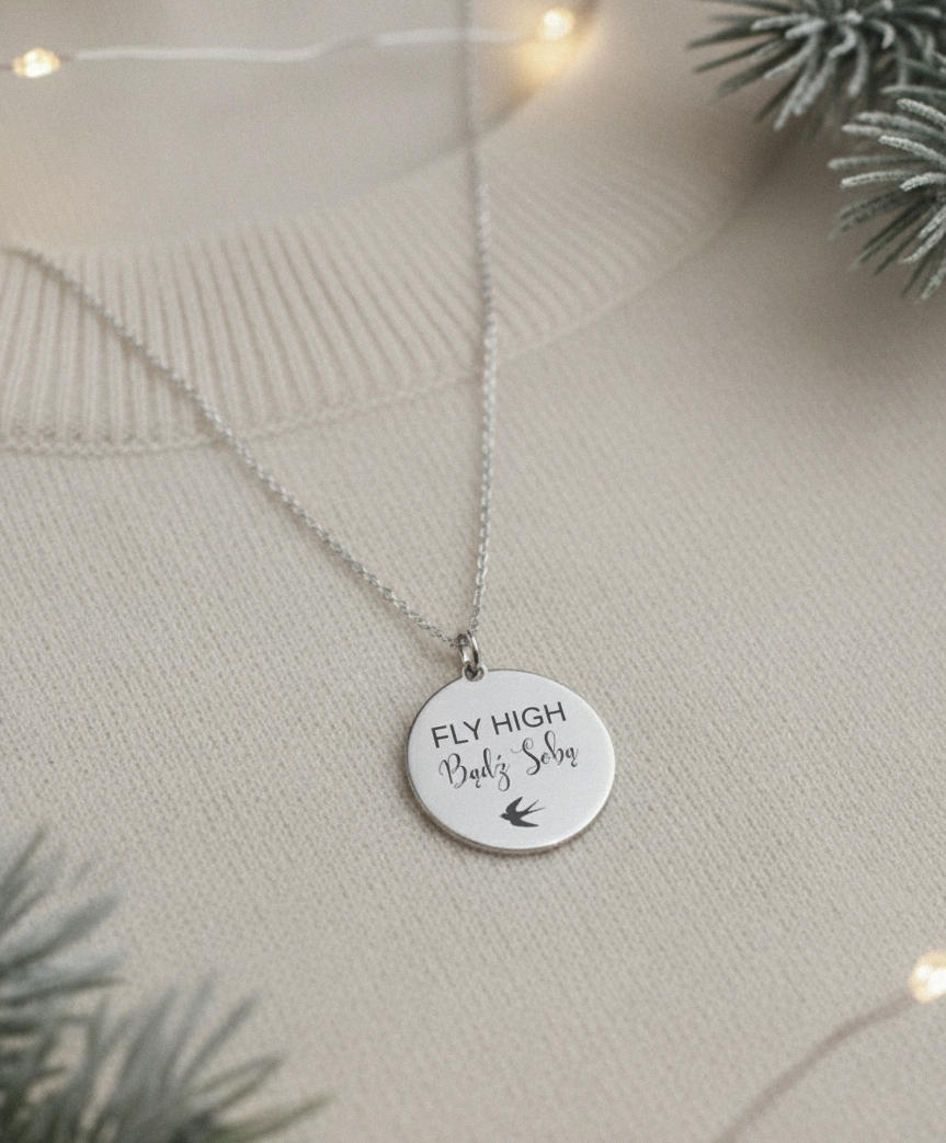 Marzysz o tym, by unieść się ponad przeciętność i śmiało podążać własną drogą? Nasz srebrny naszyjnik z okrągłą zawieszką i motywującym grawerem "FLY HIGH Bądź Sobą" to idealny talizman, który każdego dnia będzie przypominał Ci o Twojej wewnętrznej sile i wolności. Delikatna jaskółka symbolizuje nadzieję, odwagę i lekkość w dążeniu do celu.