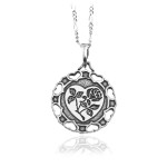 Wykonany ze srebra pr. 925. Medalion jest oksydowany, łańcuszek jest pokryty platyną.