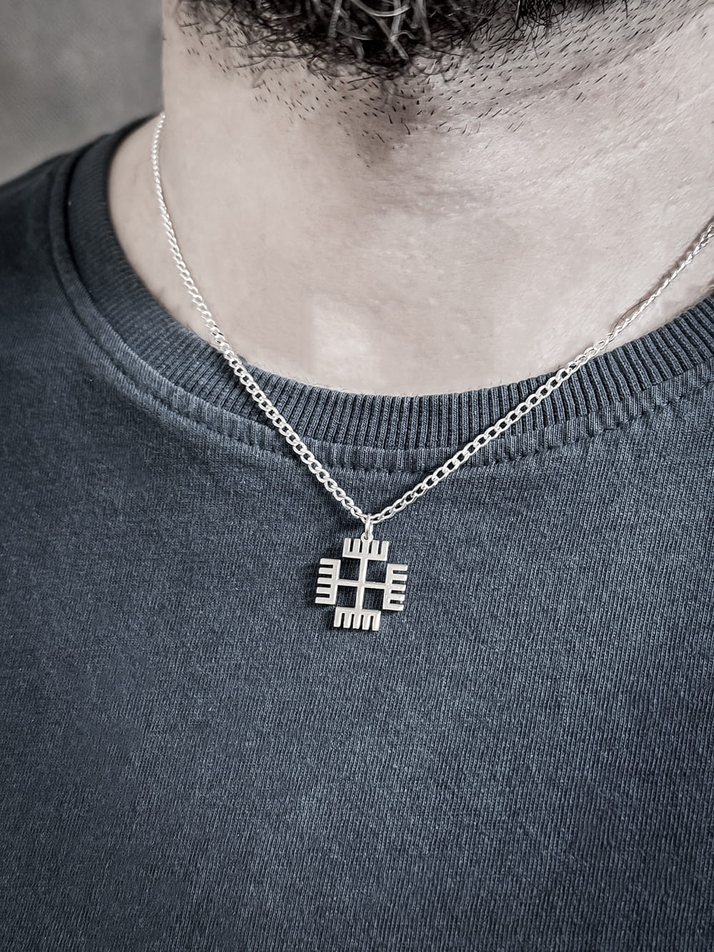 Naszyjnik wykonany jest z wysokiej jakości srebra próby 925, co gwarantuje jego trwałość i elegancki wygląd. Stylowy łańcuszek o długości do wyboru doskonale komponuje się z zawieszką przedstawiającą symbol "Rąk Boga". Całość stanowi męski i wyrazisty dodatek, który idealnie uzupełni każdą stylizację.