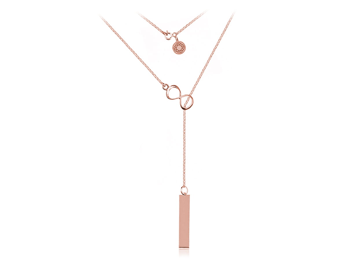 Naszyjnik z symbolem nieskończoności i prostokątną blaszką pod grawer.