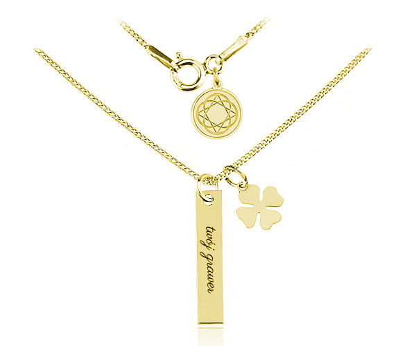 Naszyjnik srebrny Dori - prostokąt z grawerm i koniczynką - 24k złocenie
