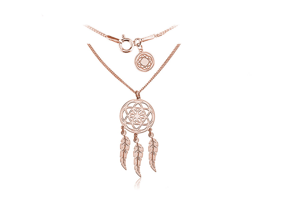 Naszyjnik z motywem łapaczy snów wykonany jest ze srebra pr. 925 pozłacanego różowym złotem. Średnica rozety to ok. 1,7 cm. Do wyboru kilka długości łańcuszka.