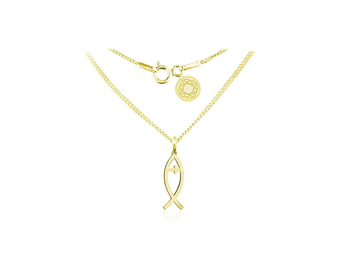 Łańcuszek z ażurowym medalikiem z symbolem ICHTYS. W całości wykonany ze srebra pr. 925 pokrytego 24k złotem.