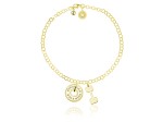 Bransoletka wykonana jest ze srebra pr. 925 uszlachetnionego 24k złotem. Długość całkowita bransoletki to ok. 19 cm (bransoletkę można zapiąć w dowolnym miejscu na łańcuszku). Zawieszka ciężarek ma średnicę ok. 1,4 cm, zawieszka hantel ma wymiary ok. 1,5 x 0,6 cm.