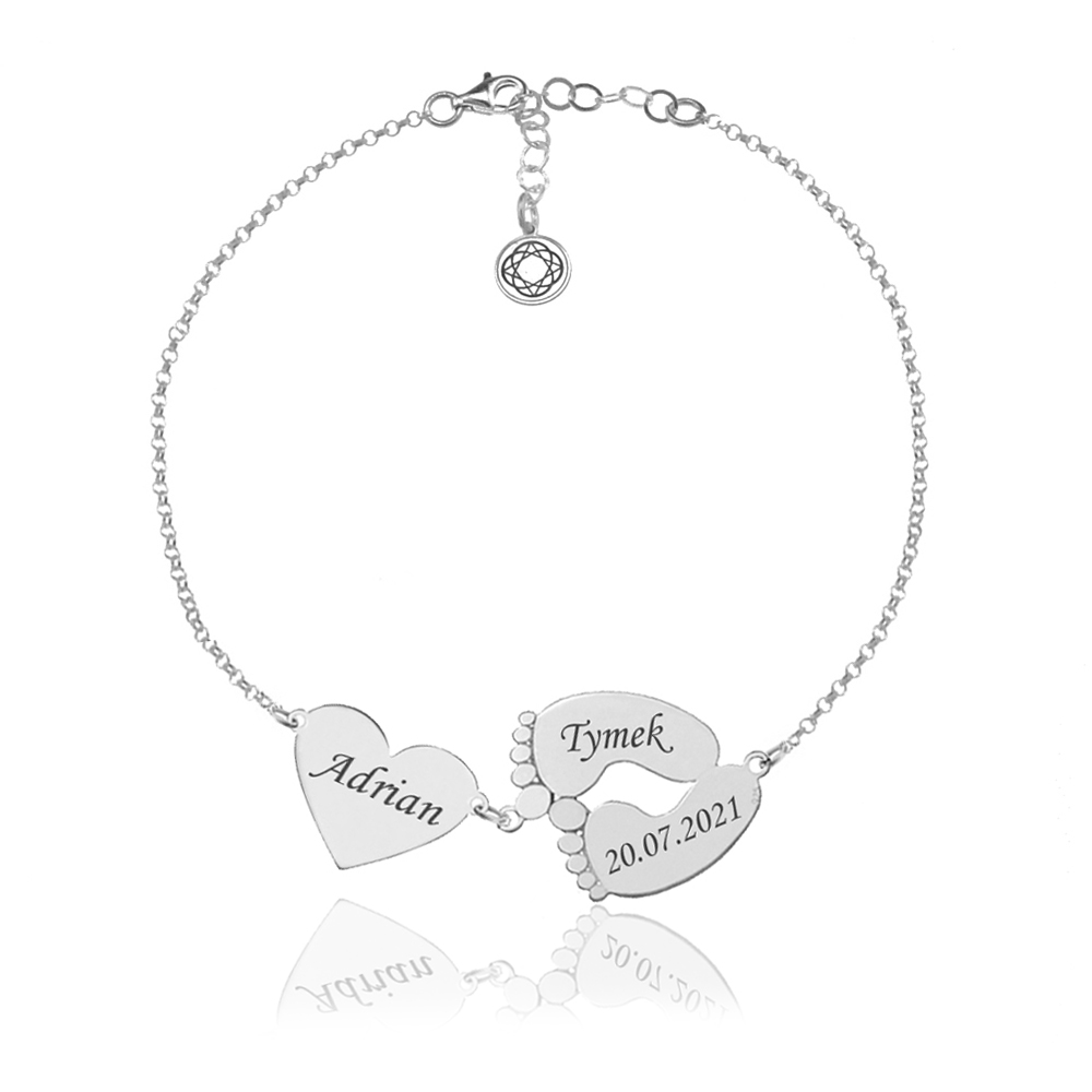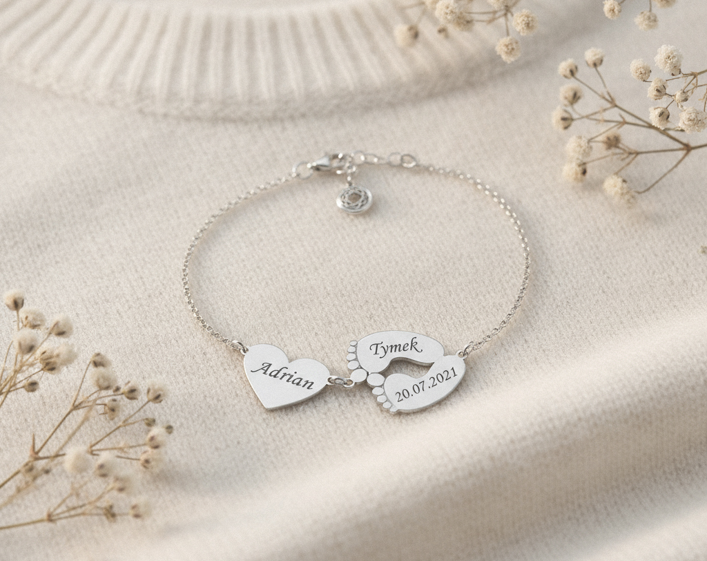 Odkryj naszą wyjątkową bransoletkę, która jest nie tylko elegancka, ale także wyjątkowo osobista. Wykonana ze srebra próby 925, ta piękna bransoletka posiada delikatne serce, które symbolizuje miłość i więź. Ale to nie wszystko - możemy spersonalizować ją poprzez wygrawerowanie na sercu i stópkach twojej treści - tworząc niepowtarzalny, emocjonalny drobiazg.