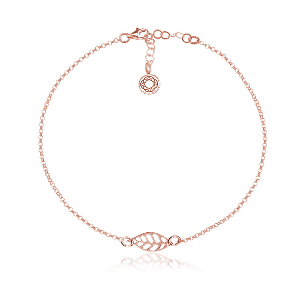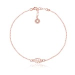 Delikatna i subtelna bransoletka ozdobiona ażurowym listkiem. Całość wykonana ze srebra pr. 925 pokrytego różowym złotem.