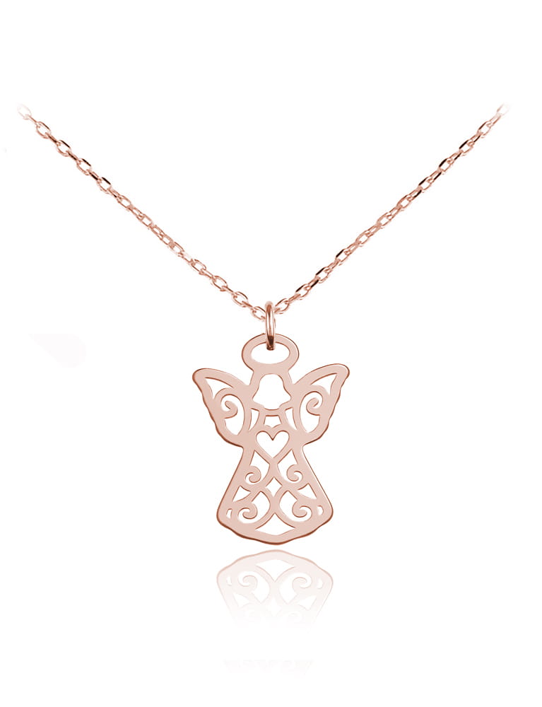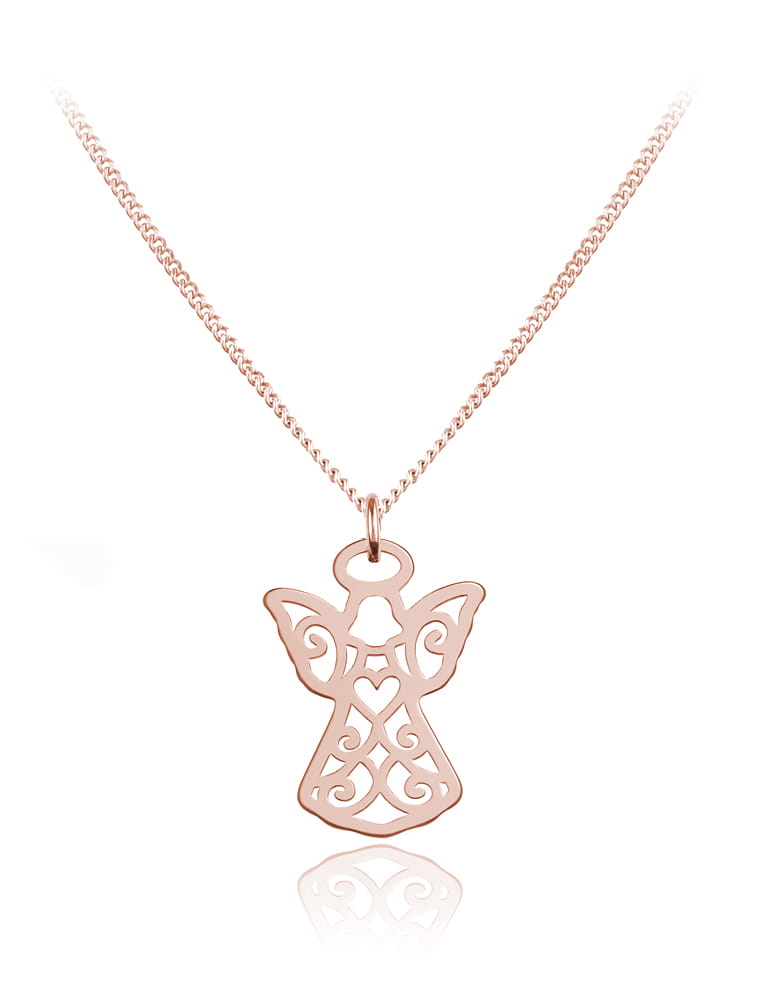 Biżuteria wykonana jest ze srebra pr. 925 galwanicznie pokryte różowym złotem. Do wyboru kilka długości łańcuszka by łatwiej było dopasować naszyjnik do siebie lub obdarowywanej osoby. Delikatna ażurowa struktura nadaje lekkości i kobiecości a anielski motyw sprawia że całość prezentuje się dyskretnie i wyrafinowanie.