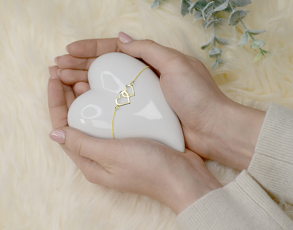 Wykonany ze srebra pr. 925 pokryty 24k złotem. Długości do wyboru. Wielkość serduszek - ok. 2,0 x 1,3 cm