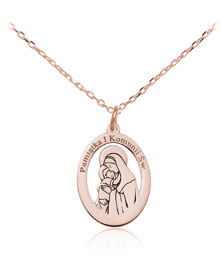 Srebrny naszyjnik - Medalik z Matką Boską - Pamiątka I Komunii Świętej - rose gold