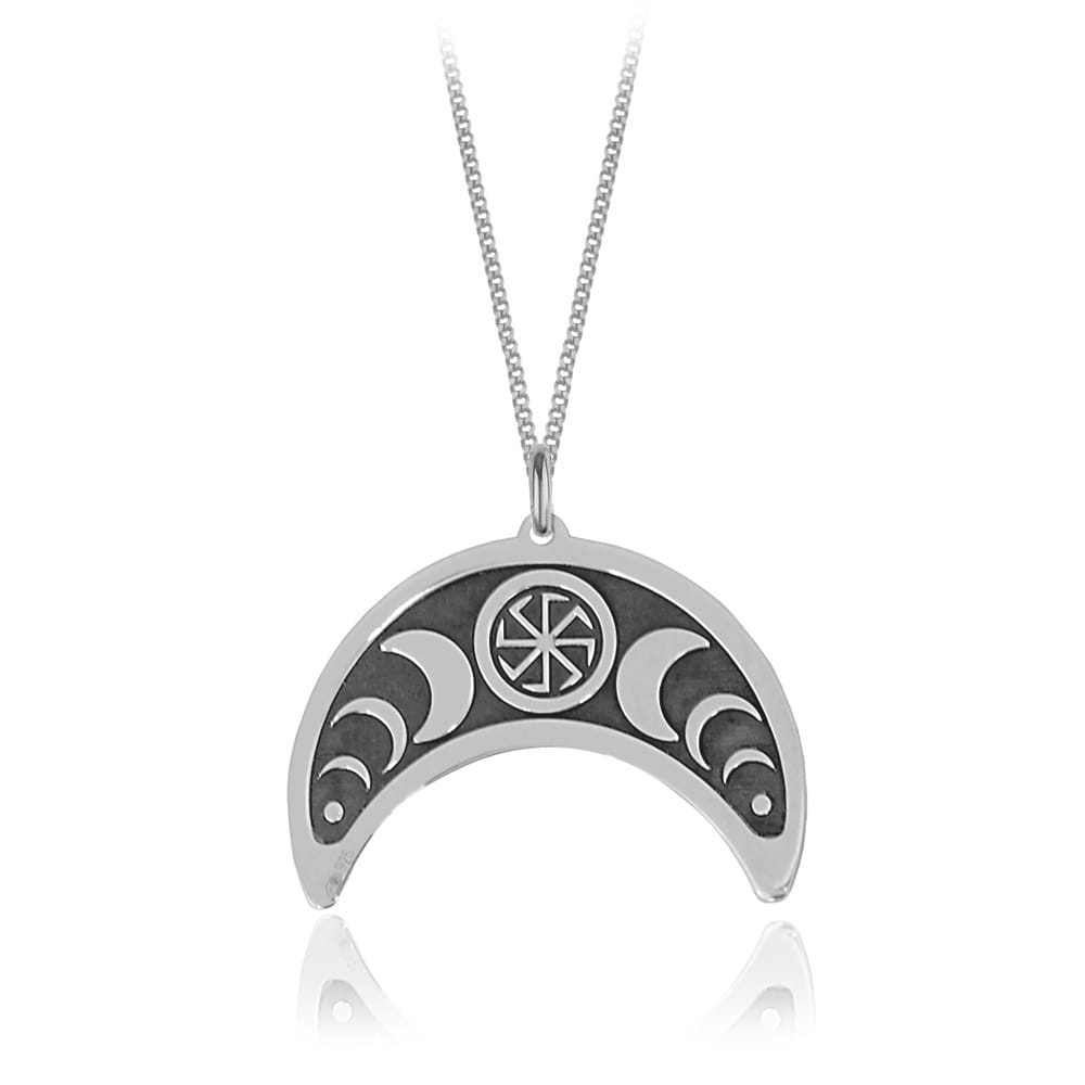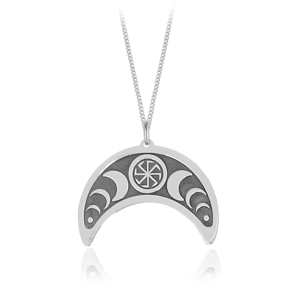 Srebrny naszyjnik Mira II - księżyc Lunula i Kołowrót - grawer
