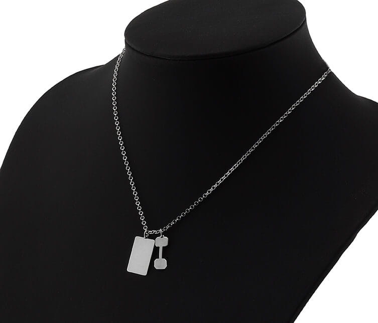 Srebrny naszyjnik z prostokątna blaszką i hantlem