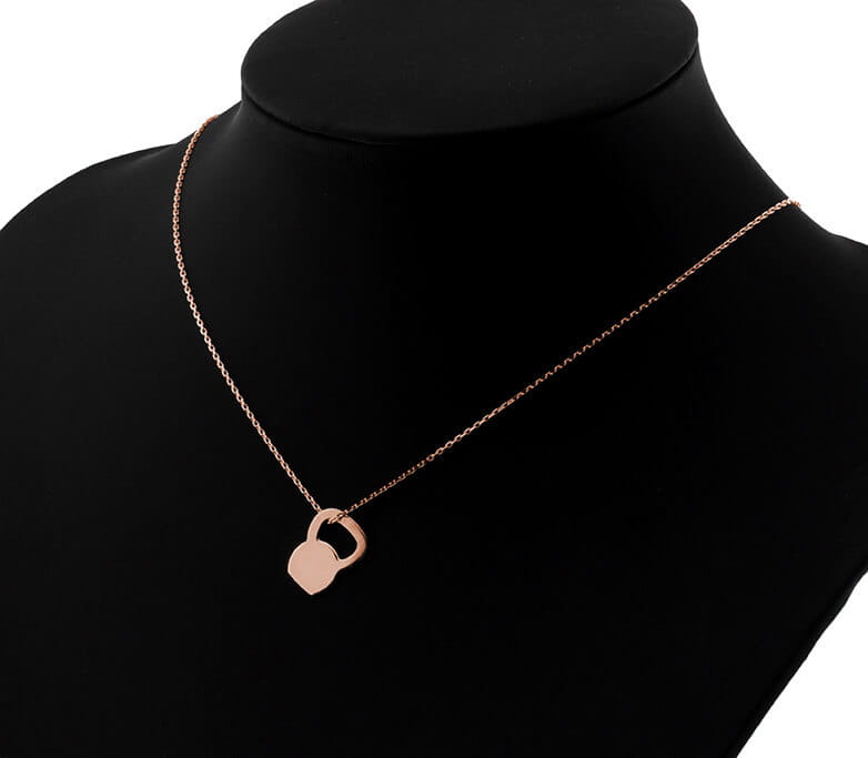 Naszyjnik wykonany jest ze srebra pr. 925 dodatkowo uszlachetnionego różowym złotem. Do wyboru są dwie długości łańcuszka. Wymiary zawieszki kettelbell to ok. 1,5 x 1,2 cm.