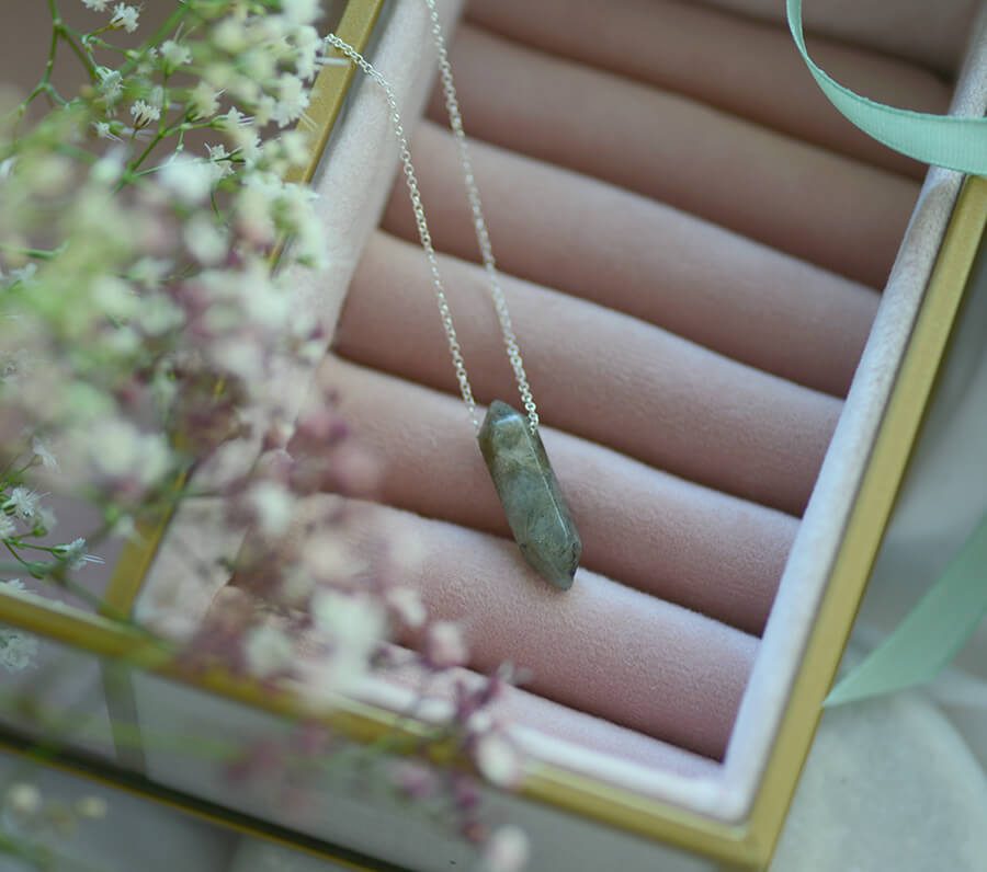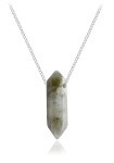 Na łańcuszek nawleczony jest naturalny labradoryt w formie sopla.
