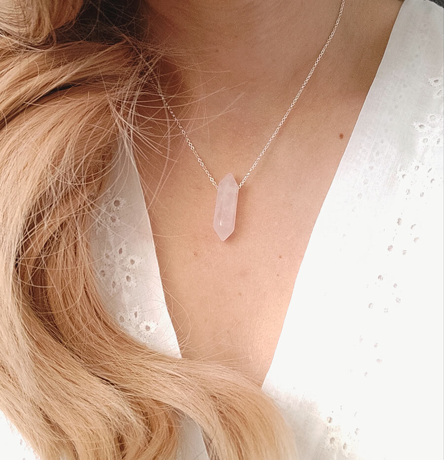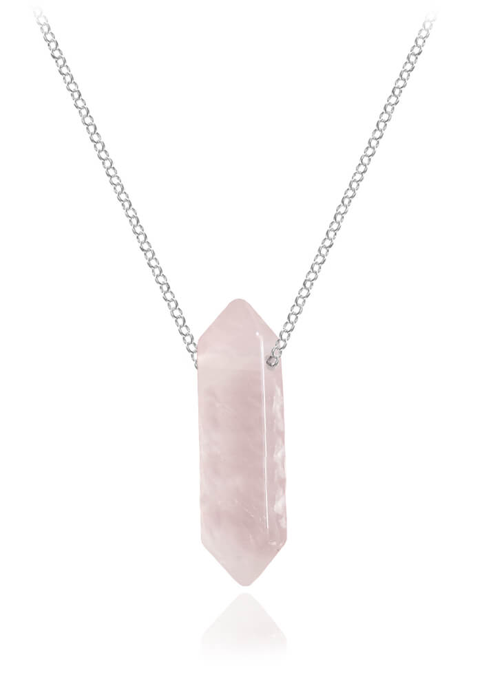 Na łańcuszek nawleczony jest naturalny kryształ górski w kolorze jasnego delikatnego różu w formie sopla.