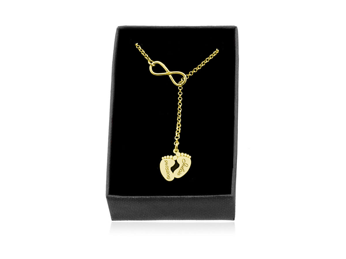 Dzięki przełożeniu stópek przez znak infinity otrzymujemy delikatny i bardzo kobiecy naszyjnik z uroczą "krawatką" o regulowanej długości co sprawia, że wspaniale podkreśli każdy rodzaj dekoltu. Stópki nie przechodzą swobodnie przez element infinity.
